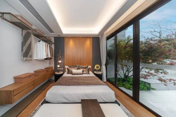 再搭配上12米宽的大面积落地玻璃,增加室内光亮的同时,还可以更好欣赏窗外的风景,最大程度实现了“引景入室”。