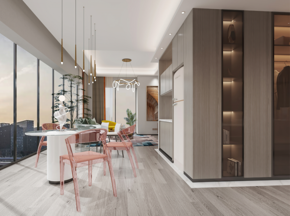 当生活是被一个又一个潮流追赶,对表象和形式的追逐好像永远没有尽头,少有人注重情感连接。老三届·悦湖却决意打造一个用以承载温情对话的空间,洽谈区配备质地轻柔的流水形皮质沙发,大面积玻璃幕墙的运用,引入更多室外光影,用心打造自然、轻松、惬意的理想空间。
