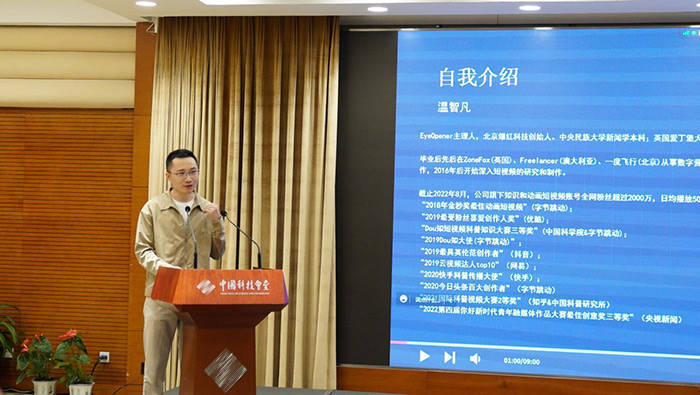 “这不科学啊”作为来自于南大、厦大、武大的内容创作团队,通过和科学少年米吴一起通过有趣的科普实验,致力培养青少年的科学素养,传递科学精神。该团队主创之一彭梓珩从专注于好玩和有趣的科学内容、遵循“实事求是,求真求实”的原则等角度分享了做科普的经验,坚持寓教于乐,学有所用,为青少年埋下“科学”的种子。