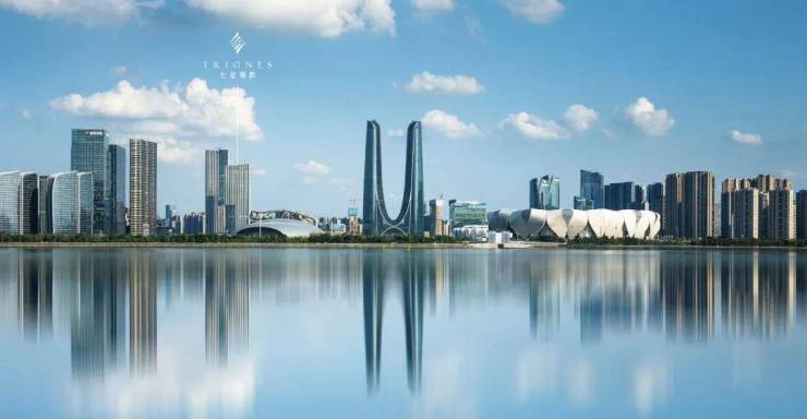 杭州萧山七星潮鸣,位于杭州新世纪中轴的核心位置,紧倚钱塘江,坐拥莲花碗与化蝶泳池,背靠国博,对望日月同辉。这里的地理位置得天独厚,直面杭州的行政枢纽——市民中心,与“日月同辉”阵列左右,形成一个完美的等腰三角形。