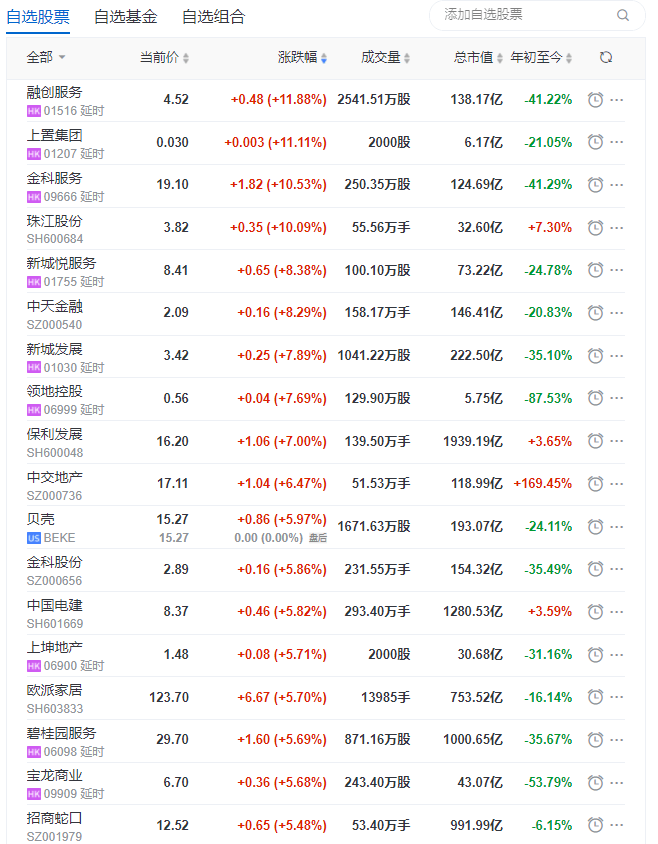 截至午间收盘,珠江股份涨停,保利发展涨7%,中交地产、金科股份、招商蛇口涨超5%,万科、新城控股、金地集团、大悦城、华发股份、滨江集团涨超4%。