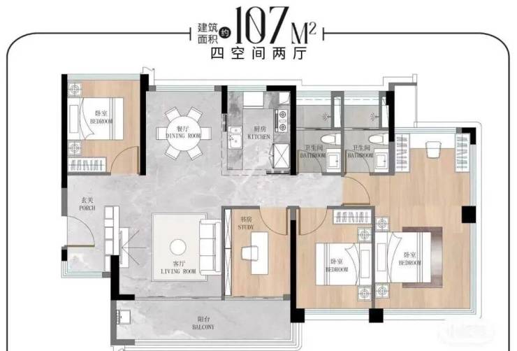 🔹建面约107㎡舒适改善四空间