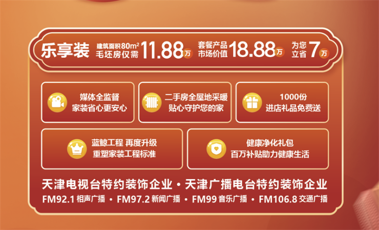凡是参加本次力天装饰所举办的二月钜惠活动,就能立刻享受《乐享装》的套餐优惠,半包+主材+全屋家具+家电+软装就能拎包入住环保家,轻松做到一步到位,原市场价值18.88万的套餐产品,在力天装饰只需11.88万,立省7万元的装修费,实现拎包入住,装修更省心。(以80㎡毛坯为例)