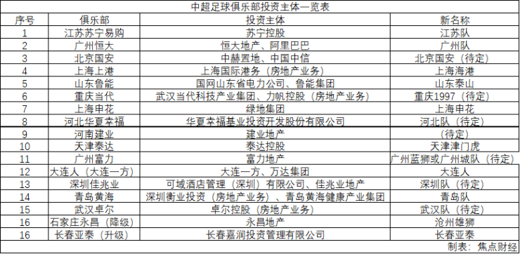 焦点财经梳理了一下2020年赛季结束时的16支中超球队,目前其背后的投资主体绝大多数涉及房地产业业务,其中地产商有12家,分别是恒大地产、中赫置地、鲁能集团、绿地集团、华夏幸福基业、建业地产、泰达控股、富力地产、万达集团、佳兆业地产、卓尔控股、永昌地产。
