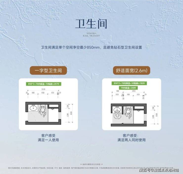 在卫生间的设计上,需确保单个使用场景不低于850mm,如洗漱区850mm+马桶850mm+淋浴850mm,通过合理化的卫生间设计,增加同时使用卫生间人数,以减少全家人的使用等待时间,让生活更加从容。