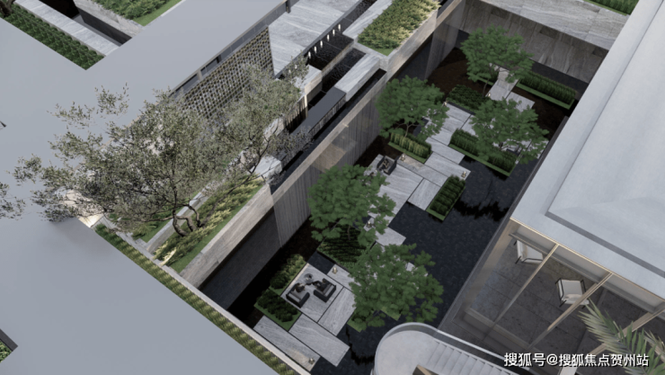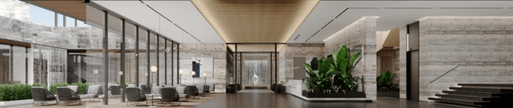 地下车库入户大堂前车马厅设计,借鉴了“港式归家”的理念,一般多在香港高端酒店采用,作为归家的第二道门,既温馨明亮,又超具昭示性。酒店式归家大堂与定制化下沉会所相结合,在负一层引入瀑布景观,整个景观体系更加立体。