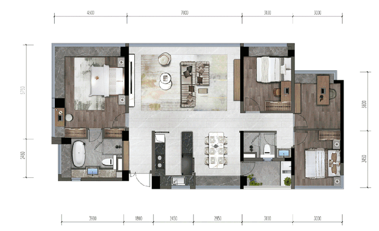 华发基于对众多家庭生活习惯的深刻洞察,设计了一款“3+1”房户型,拥有约11.4米超长观景面,为每一个刚改家庭“量身定制”。公区同样是LDKB一体化方厅的设计,U型厨房+约6米宽厅+阳台,强调互动和交流。