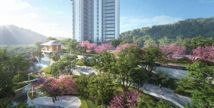 项目依山而建,汲取现代东方禅意,打造共计约9万㎡中央园林,藏纳2座自然山岭,约2.1万㎡山体花园;选用百年大榕树、50年树龄朴树、乌桕等名贵花木,让建筑藏身于绿树繁花间。