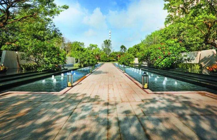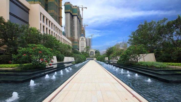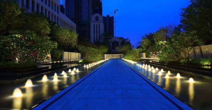 -轴线迎宾水景中叠水与涌泉交融,层次鲜明,错落有致,营造仪式感的同时又地增添几分动感