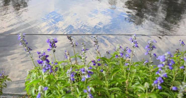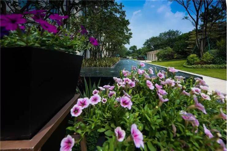 -为配合主入口与水景广场轴线、仪式感强烈的景观氛围,植栽设计多采用对称式布局,采用了凤凰木、鸡蛋花、兰花鼠尾草等具有华南特色的本土植栽