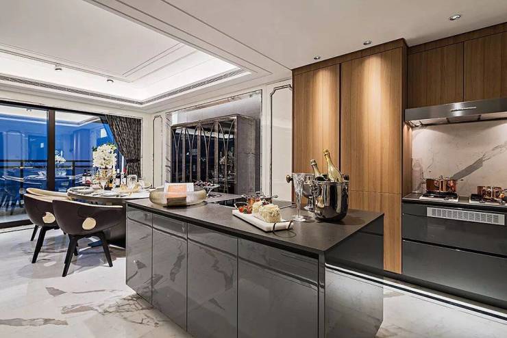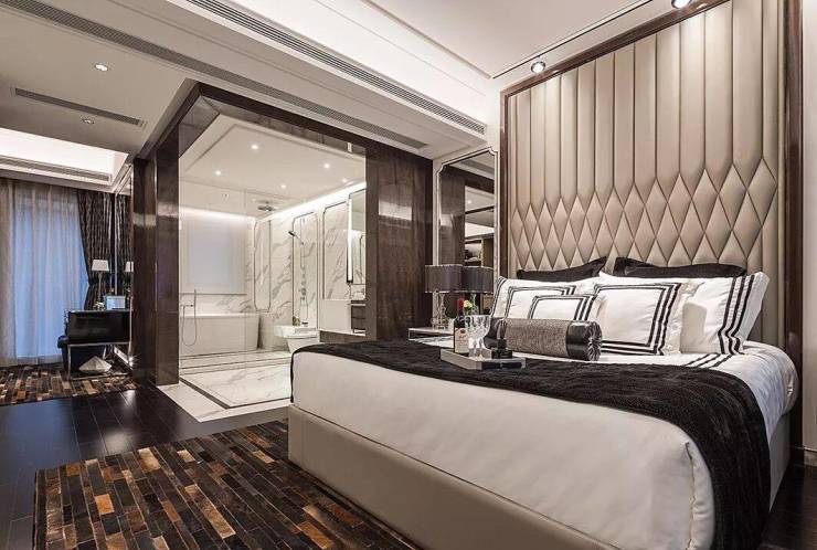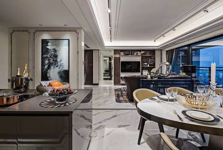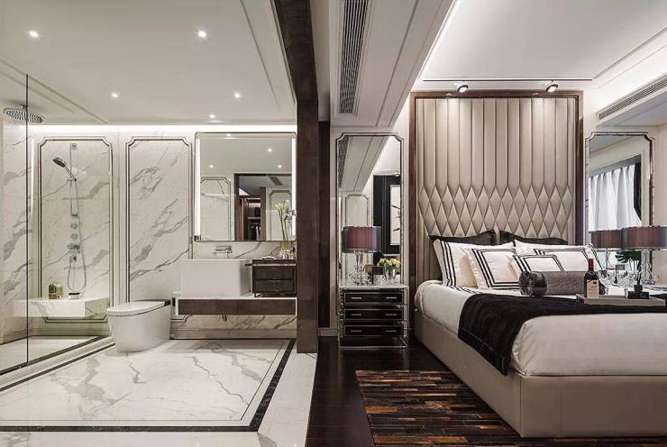 168平米的华发广钢样板房的目标人群面向成熟家庭,客厅的大阳台开间长度跟客厅及厨房相对,铝合金的推拉门给予最大活动幅度的一扇, 将开放式厨房、餐厅和书房,展示空间解构成一个联动的开敞社交空间,为该户型带来革命性的新气象。室内建筑采用极简派的色调,但以家具布料的大胆选用作为补充,并搭配其它元素,比如定制的步入式衣柜,手缝皮革抽屉,木饰面板和意式白色大理石装饰的卫生间墙面和台面,从而营造出奢华,精致的氛围。