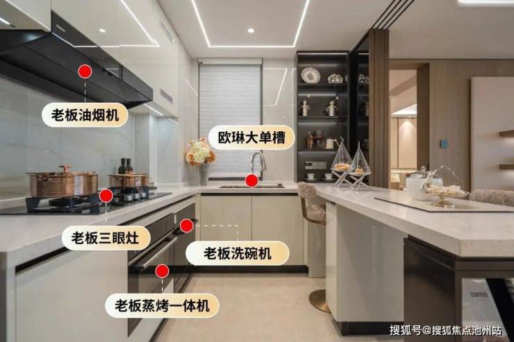 厨房:老板油烟机、三眼灶、蒸烤一体机、洗碗机四件套齐全;欧琳的大单槽,方便锅具等大厨具清洗。