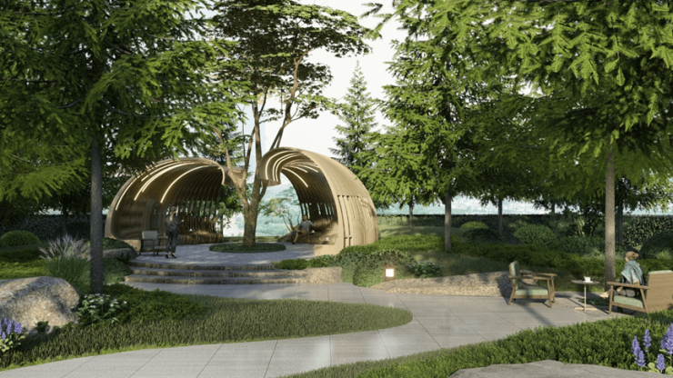 社区核心的中庭区域,利用栈桥,实现一层变两层的廊架方案,达到社区内双层联通的效果,同时完美解决了核心区与社区的高差。富有山地特色的生活场景–穿林过水,依山就势,立体化的核心花园得以美美地呈现。
