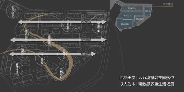 以三条景观归家轴线(休闲放松轴、邻里共享轴、核心森林轴)、五个云中之境(初入云林、登云望林、观云流溪、云庭之境、隐享云山)、十个精致生活花园(初见云山、云林溪谷、云栖望远、伴山观云、林闲汀兰、晴林漫道、疏影微风、云雾雅集、天光云影、云深隐乐)为整体园林布局,构建精致感多重生活场景。同时以三级绿廊步道(快速归家动线、景观归家动线、场地游园小径)串联整个园区,景观节点延步道分散排布,做到楼楼是核心,栋栋有花园。