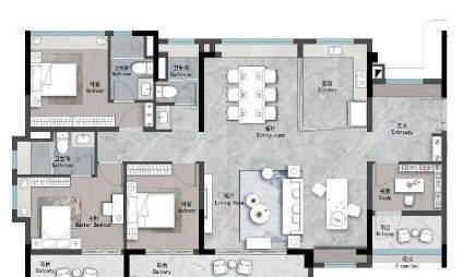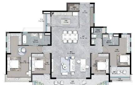 建面约140㎡四房两厅三卫,堪称改善户型标杆,实测5开间朝南,南北通透,采光视野极佳。客厅与次卧配备联通阳台,书房单独设置阳台,进一步拓展活动空间与采光面,主卧面积超25㎡,配备独立卫浴、衣帽间,尊享私密舒适生活;三次卧均约10㎡,空间尺度充足,可满足家庭不同成员的居住需求。建面约182㎡四房两厅三卫,定位高端改善,实测空间开阔通透,客厅面宽达7.2米,搭配全景落地窗,俯瞰社区园林景观,彰显尊贵气度,多套房设计保障家庭成员居住私密性,适合高端置业群体。