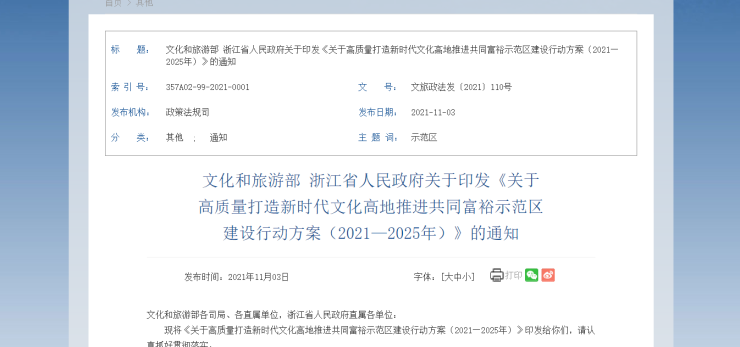 文化和旅游部、浙江省人民政府印发行动方案高质量打造新时代文化高地 推进共同富裕示范区建设