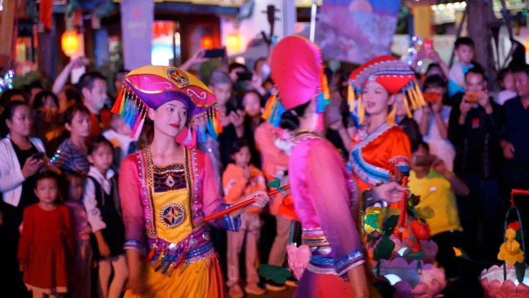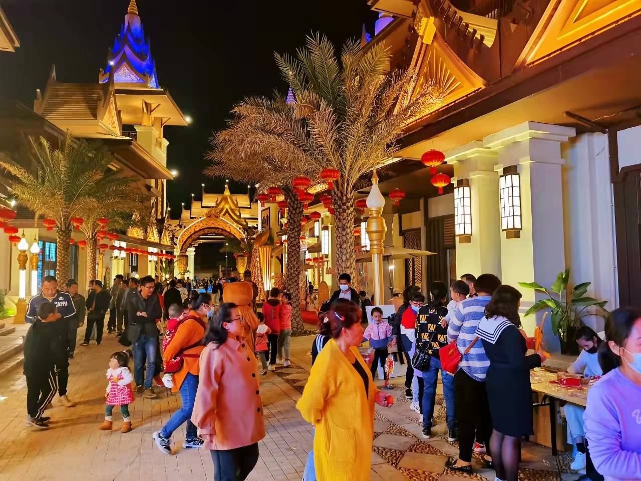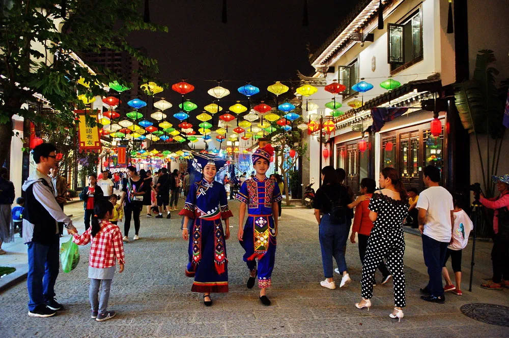 国庆期间,傣族古镇结合当地民族特色举行摆勐傣金秋购物狂欢节,另有街区演艺活动,让游客在浓厚的文化氛围中,欢度国庆。