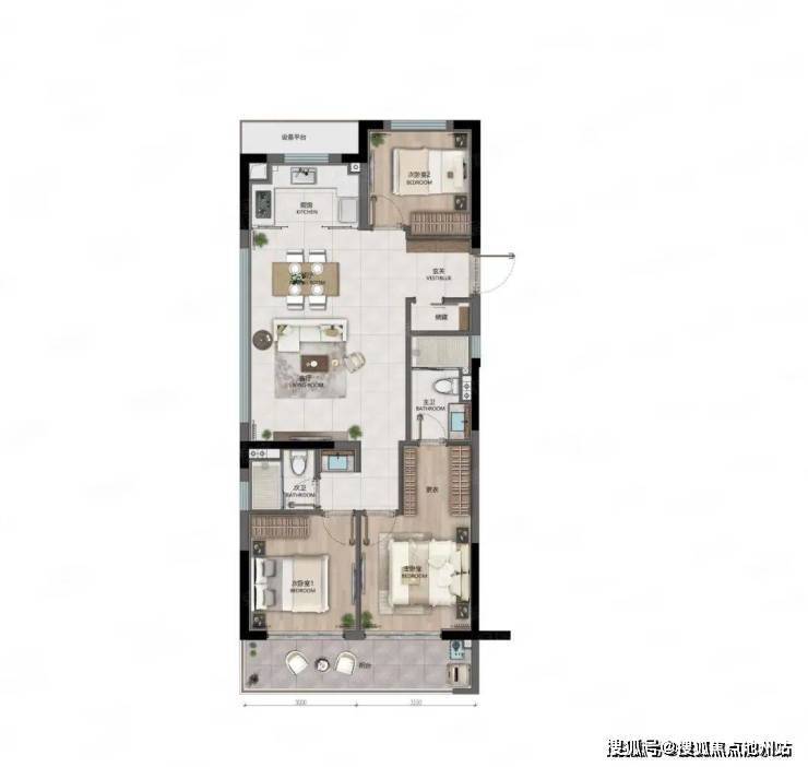 112平米 户型:边厅设计为落地窗,三面采光通风、大尺寸餐客厅(横厅面宽约 5.9米);可以做到拥有独立收纳空间(衣帽间、储藏室)设计;没有过道,浪费空间少,利用率高。