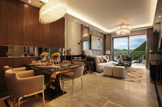 大夫山·尚东全新样板房的设计,以暖色调为主,无论是人性化的灯光效果、铺满墙壁的石材色泽、还是艺术个性的软装搭配,均是舒服的暖黄色系列。