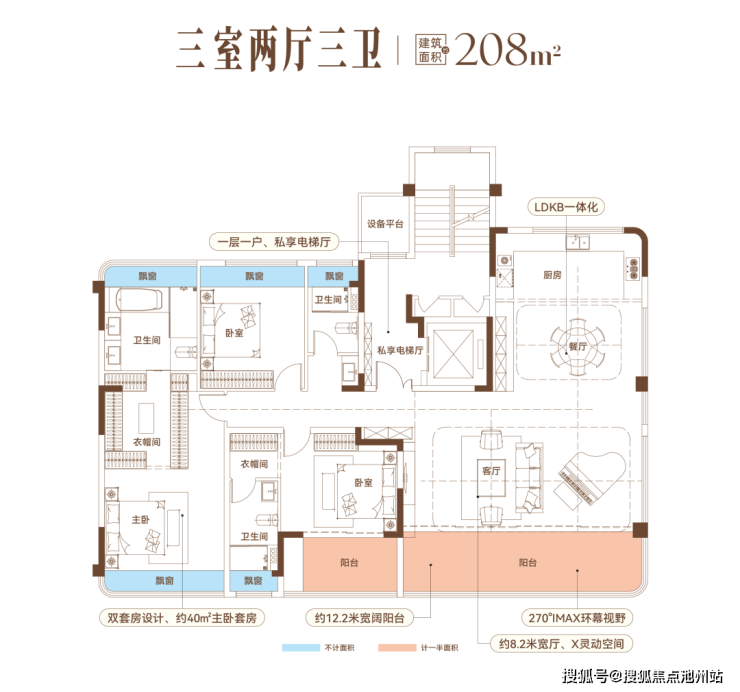建面约208㎡户型打造三室两厅三卫产品,LDKB一体化设计、约18.2米的南向超级面宽、约12.2米跑道级阳台、客厅面宽达到约8.2米......视野采光无敌!