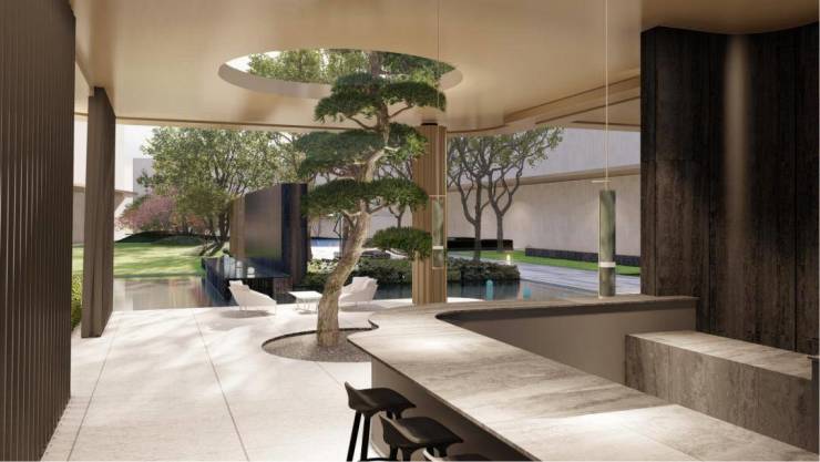 旁边半围合的室外会客厅,「长」在水庭中央;下沉式会客卡座,可以享受独处时光,也可以和邻居友人聊聊时事财经。