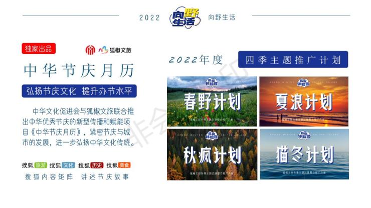 狐椒文旅携手中华文化促进会、中华节庆协作体、搜狐文化、搜狐旅游共建的“中华节庆月历”项目,结合历史、经济、文化三个维度的宏观价值,通过对吃、住、行、游、购、娱六个要素的微观价值输出,同时推荐优秀节庆的城市、文旅目的地,带动当地消费,促进了节庆文化的可持续良性发展。项目将通过直播、海报、访谈、视频栏目、原创文章等多种形式呈现,按节庆多维度对项目产品进行推介,以节庆为主题产出丰富的、系统的原生内容。