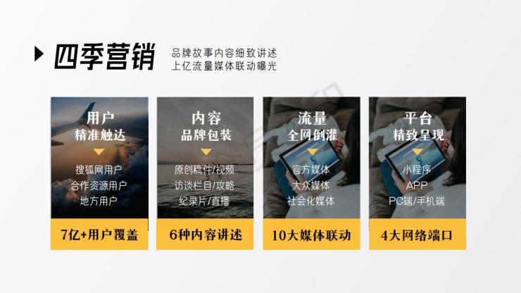 狐椒文旅“文化挖掘+内容赋能+资源开发+媒体传播”的服务矩阵,联动搜狐文化、搜狐旅游、搜狐美食、城市体育等多个搜狐域内垂直生活平台,在搜狐平台内进行发声,在垂直各领域内较大化实现生活方式以及价值的传播,将可视化内容通过搜狐强大的流量分发平台和全国300家城际公司传递给中国16亿用户,并通过小程序+社群运营,实现爆炸式裂变传播,提升用户转化。