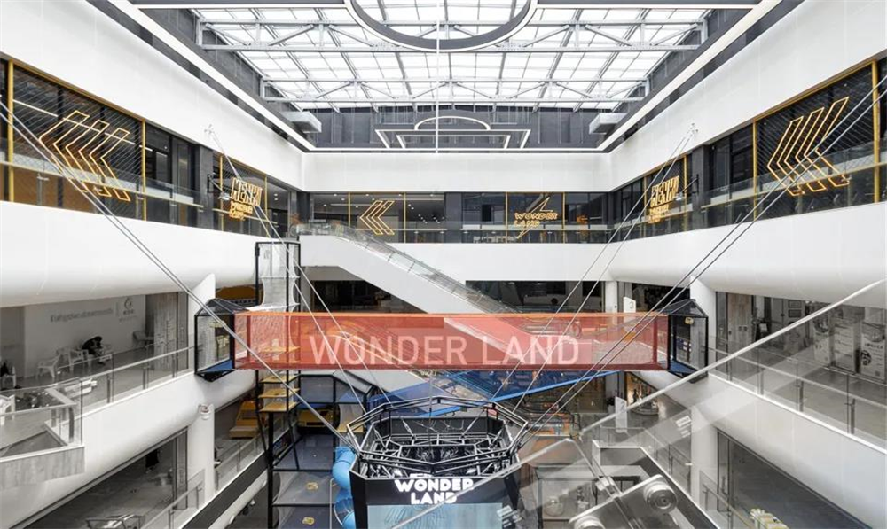 亲子互动与教育培训,也是该综合体的另一大核心板块。设计师在这一表达上,运用了更加大胆的创意,为孩子们打造出一处别具一格的新玩法。以童眼看世界,是为孩子打造魔法世界的较佳创意源。一切从好玩、探索生发,在中庭的挑空里,搭建出一座独特的魔法桥,攀爬,穿行,平行时空里的擦肩而过,瞬间化身独具意趣的游乐场。