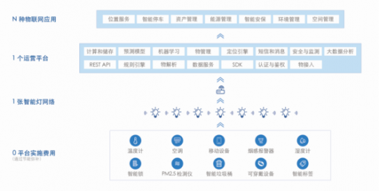 用户部署云智照物联智慧灯可实现:0成本物联网接入,1张智慧灯网络,1个运营平台,无限量应用拓展。