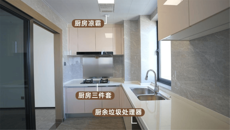 L型操作台前,品牌灶具的蓝色火焰静静舔舐着锅底。凉霸送来习习凉风,吹散了烹饪时的燥热。备餐时的果皮菜叶,随手投入台下垃圾处理器,厨房始终清爽无异味。傍晚备宴时,生活阳台的自然光洒满操作台,连洗菜都成了惬意时刻。深夜取水,柜内的智能感应灯自动亮起,转身又悄然熄灭——光影之间,尽显生活的细腻与体贴。