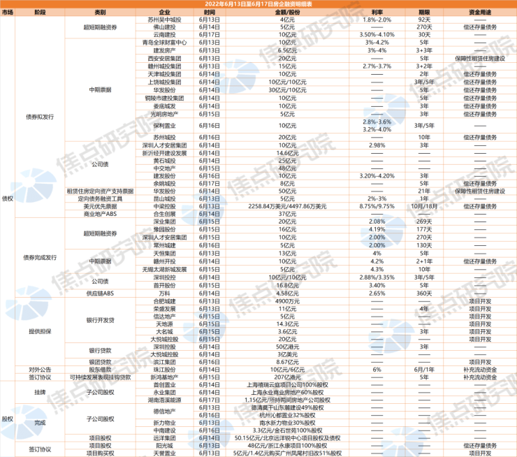 本周,股权融资市场有9家企业参与,随着销售与融资逐渐恢复,股权交易市场中的买方逐渐活跃起来,积极把握窗口期以较低成本扩充土储。其中,滨江集团“抄底”阳光城,以48亿元总价收下永康项目,比此前公布的价格便宜9亿元。德信地产转让两家子公司股权以缓解现金流压力。远洋集团将其持有的“远洋锐中心”项目34.5%股权出售给合作方平安人寿,回收现金流50.15亿,此前4月远洋集团的颐堤港一期项目也通过引入中国人寿置换出30亿,短短两个月远洋集团通过出售商业资产回笼80亿,且同时保留了两个项目的运营管理权。近期面临较大境外债到期压力的天誉置业则是以期权方式筹资5亿元,期权对应的是1.4亿元购买广州凤尾村旧改51%股权的权利。
