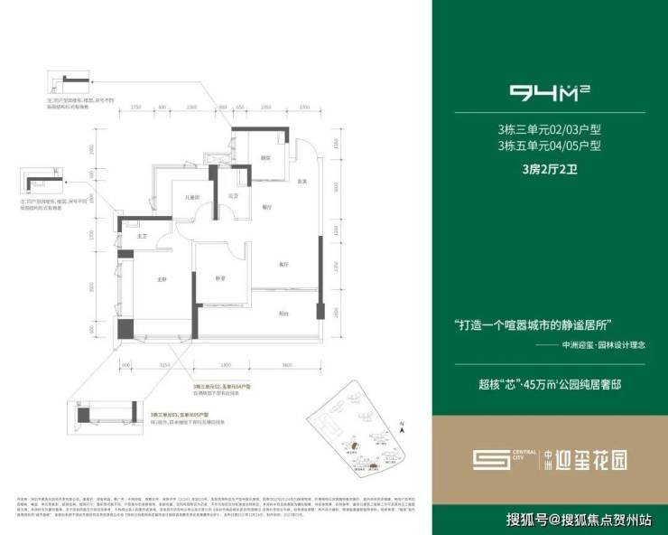 经典竖厅,客厅和两个房间朝南,6.4米长的客厅大阳台连接次卧,赠送面积有14.21㎡,东南或正南朝向。中洲迎玺三期 售楼处电话:400 006 8087。相比二期96㎡使用率有增加,主卧、儿童房设计成双飘窗,是新规户型常见操作,并打通客厅与次卧阳台!