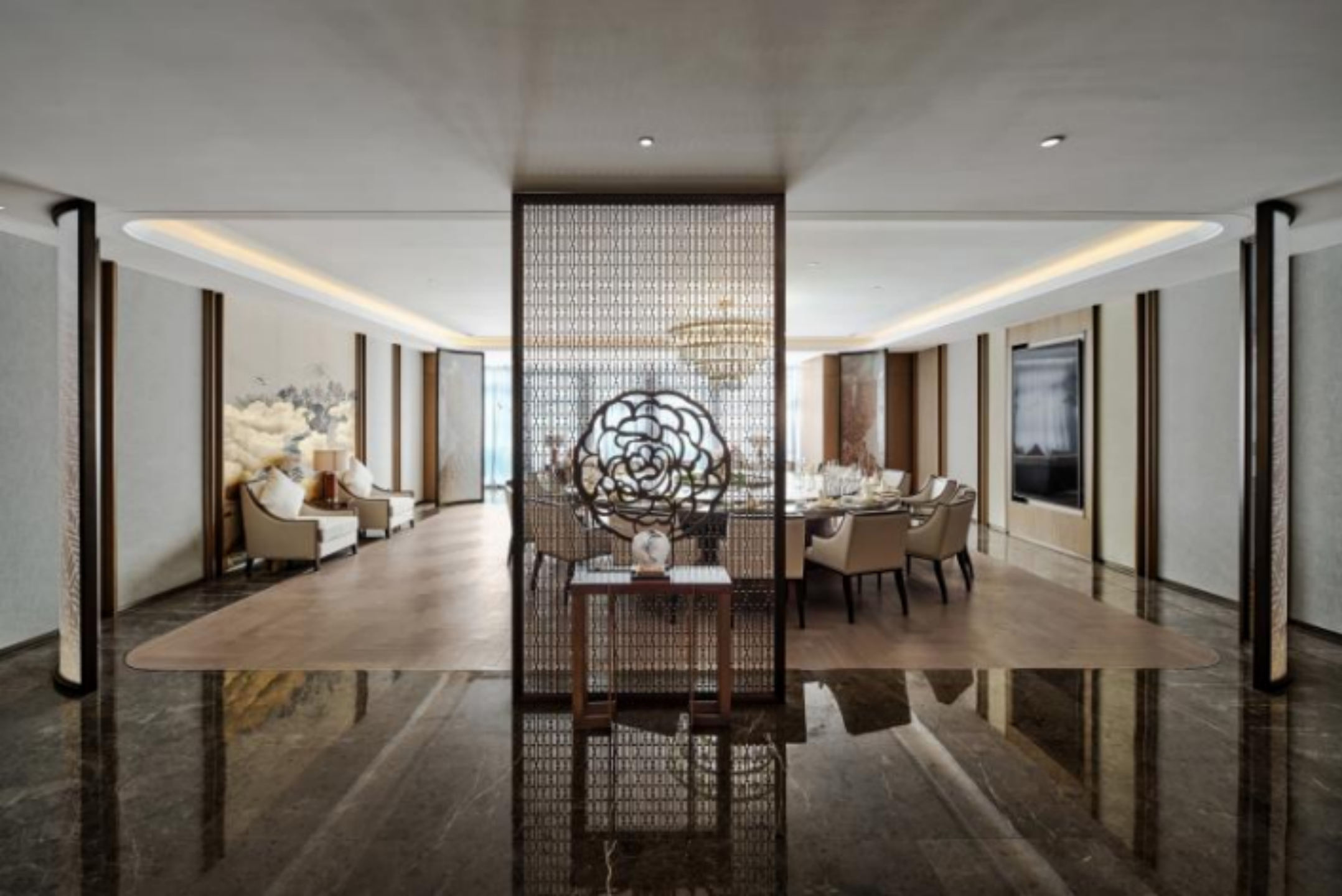 金科大酒店以重庆「山」、「水」、「城市」、「山茶花」为主元素,融入各个空间。沉浸式的体验,源于这座城市各个角落的文化演绎。