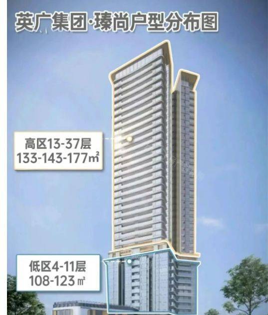整个项目分为高低区,户型分布各有不同。1 - 3 层为裙楼商业,包含公建配套以及室内恒温泳池、健身房等商业设施。12 层和 23 层为架空层。低区 4 - 11 层,2 梯 8 户,户型为 107 - 108 - 123㎡三房;高区 13 - 37 层,专梯专户,户型为 133 - 143 - 177㎡三四房。