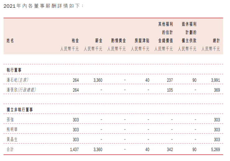 老板潘石屹的年薪为399万元,妻子张欣为36.9万元。其余三位独立董事年薪均为30.3万元。