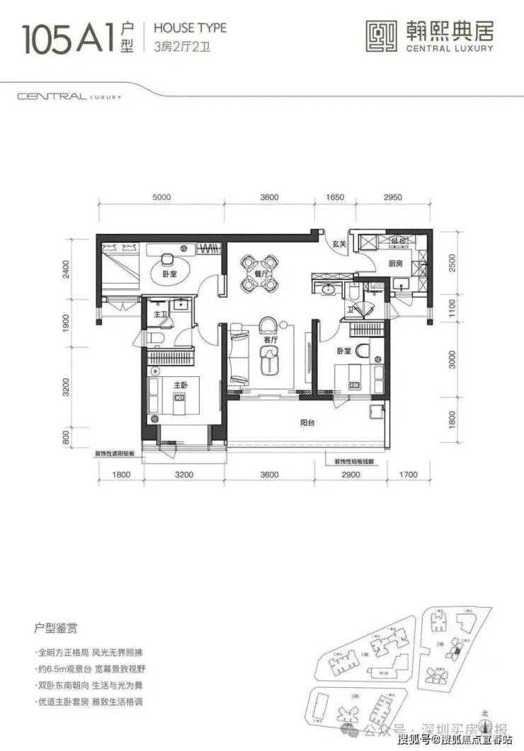 该户型为 02 地块的唯一一条腿,非常稀缺。户型南北通透,带大主卧套房的奢居型三房。带 5.35m 观景台,大横厅奢阔空间设计,主卧同客厅阳台、餐厅三面宽朝西南。北向双次卧、双卫生间、拓展空间共五面宽一字排开,视野全面俯瞰社区内园林,静谧舒适。