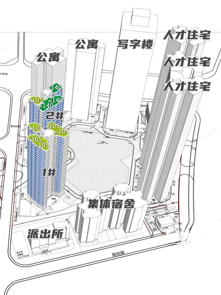 东地块规划有2栋住宅、2栋公寓、1栋写字楼和3栋人才房,住宅总货量预计265户。