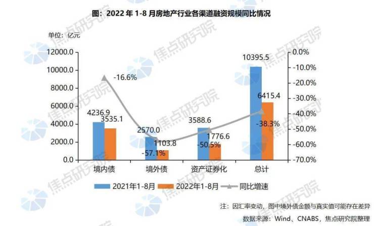 房企融资总额降幅再度平稳,风险事件已被市场消化。2022年1-8月,房企通过境内债、境外债和资产证券化三种渠道共融资6415.4亿元,同比下降38.3%,降幅较1-7月缩小1.3个百分点。深入各渠道来看,境内债1-8月同比下降16.6%,降幅较1-7月缩小1.2个百分点;境外债1-8月同比下降57.1%,降幅不变;资产证券化1-7月同比下降50.5%,降幅缩小1.2%。综合来看,1-8月累计融资总额已经走出了此前“停贷”等风险事件的影响,同比来看各渠道降幅均有小幅提升。