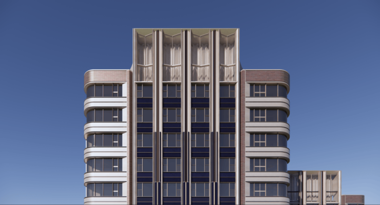住宅立面颜色以珍珠蓝为核心,搭配香槟金、海派红,两侧还采用弧形设计,比方正的建筑看起来更柔和,也让视野更大化,实现约270°观景。