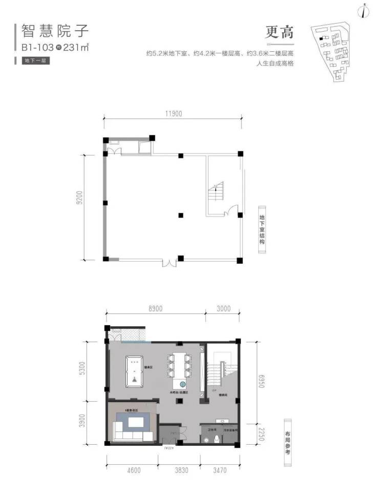 超5.2米地下室层高,约4.2米首层层高,约3.6米二层层高,最大600方超大前后花园