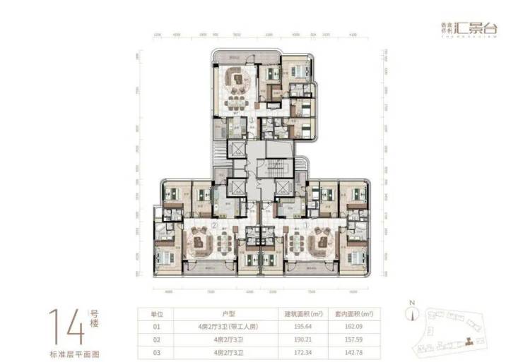 项目规划包括14栋12层的小高层,共有408户。户型面积段在123-352平方米之间,主要是三至五居室。