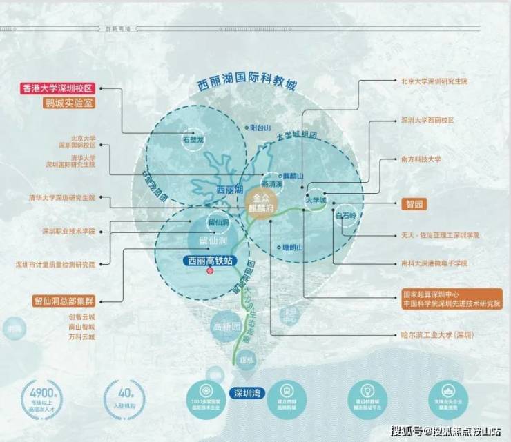 执掌湾区科创核心,定鼎城市未来价值高地。集智纳贤、创新不断。规划面积69.8平方公里的西丽湖国际科教城正显现“创新加速度”,从2002年开始,深圳在其周边布局了大学城,清华、北大、南科大等高校,以及鹏城实验室等科研机构相继入驻。目前,这里已集聚35名全职院士、多所高校单位超8.6万名在校师生,入驻国家、省、市级创新载体超500家,日渐形成粤港澳大湾区发展的“知识引擎”。