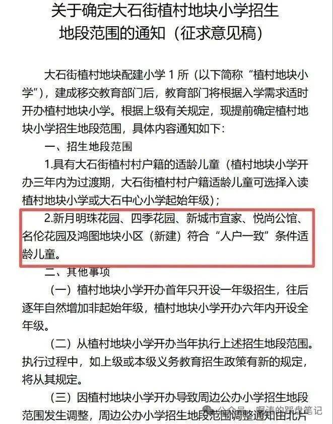 越秀·鸿璟台这刚好划进植村地块小学招生范围。就是那张征求意见稿里,圈出的 “新月明珠、四季花园、鸿图地块新建小区”片区。