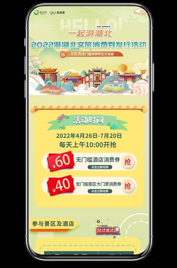 据了解,本次活动主题为“Hello!一起游湖北”,文旅消费券依托“游湖北”APP和微信小程序等发放,活动将持续发放到今年年底,节假日可使用。