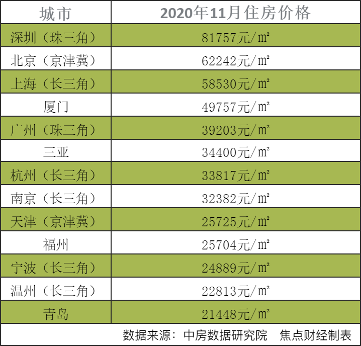 以2020年11月房价来看,房价超过两万每平米的城市也基本处于这些地区。
