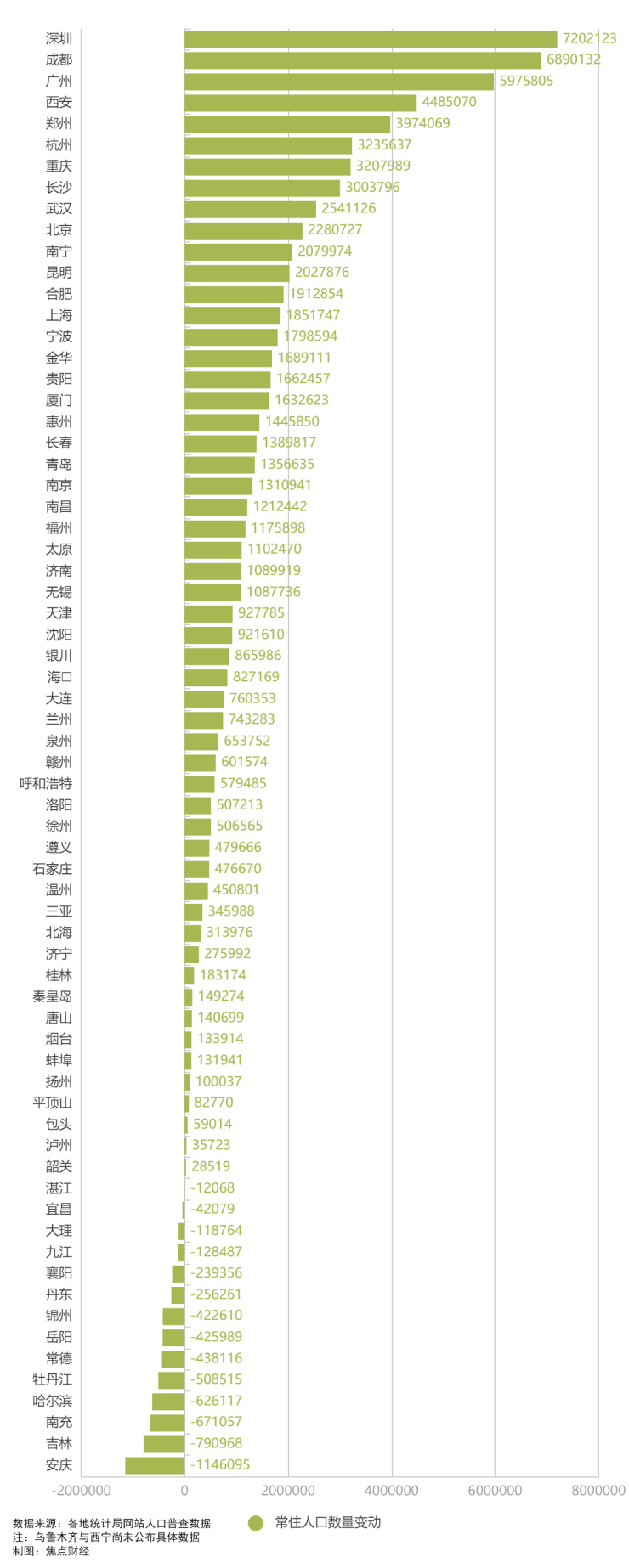 近日,随着各城市的七普人口数据逐步披露,城市人口的流出流入情况才渐渐浮出水面。焦点财经统计了70个典型城市的七普人口变动,并按照人口流入的多少进行了排名(见下图)。
