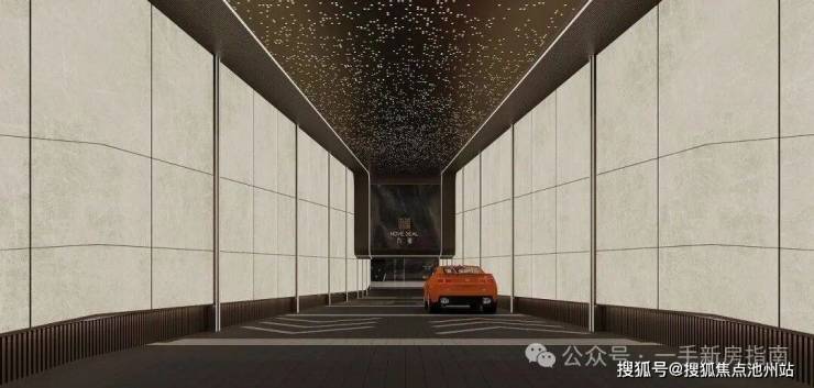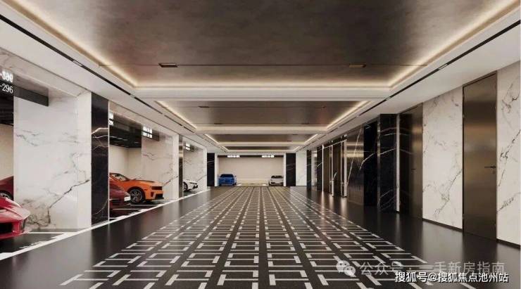作为豪宅的第二门面,地下车库也极具豪宅气度。地库坡道墙面选用仿云石亚克力透光板,还规划了星空顶及奢石迎宾墙……