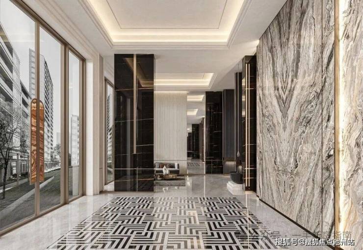 首层大堂门头采用了石材+铝板+格栅,就连电动平开门门扶手就选取了老虎玉奢石来打造;入户大堂、立柱、地面都是处处都有奢石和石材;