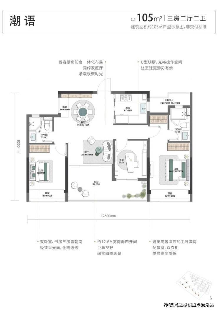 首先,项目的户型起步就是四开间朝南的建面约105方三房:
