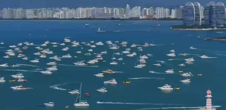 在湛蓝的海面上,远远望去,上百艘白色的游艇在三亚凤凰岛周边几乎挤成一团,万箭齐发造成了一种看似“堵港”的场景。